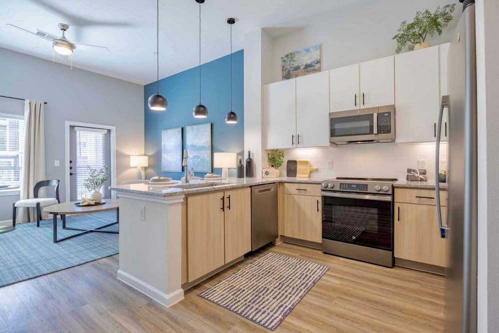 It’s easy to imagine the life of leisure that awaits when you look at all that The Abbey at Veramendi has to offer. Starting with your open floor plan home that’s stacked with modern features, like smart home technology, slate appliances, and a full-size washer and dryer, and the abundant community amenities that are just outside your door, including a bier garden with horseshoes, billiards room, and bark park. This is so much more than standard apartment living. Step out to lovely views on your private patio or balcony, or step into your gourmet kitchen for a bite. Every step you take looks good here.